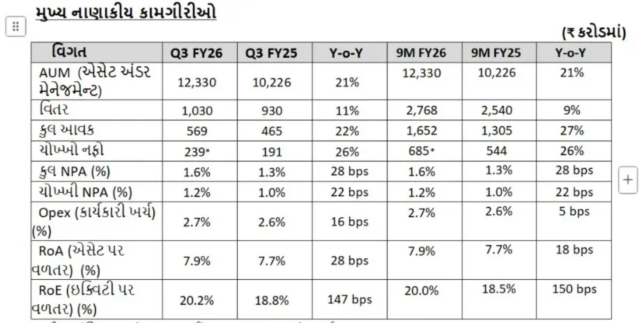 સમીક્ષાના ત્રિમાસિક ગાળા માટે ચોખ્ખો નફો ₹239 કરોડ થયો હતો, જે વાર્ષિક ધોરણે 26 ટકાની વૃદ્ધિ છે. આ જ ગાળામાં RoA/RoE (એસેટ પર વળતર/ઇક્વિટી પર વળતર) અનુક્રમે 7.9 ટકા/20.2 ટકા રહ્યું છે. નાણાકીય વર્ષ 2025-26ના પ્રથમ નવ મહિનાના ગાળામાં ચોખ્ખો નફો ₹685 કરોડ થયો હતો, જે વાર્ષિક ધોરણે 26 ટકાની વૃદ્ધિ છે, જેના પરિણામે RoA/RoE (એસેટ પર વળતર/ઇક્વિટી પર વળતર) અનુક્રમે 7.9 ટકા/20.0 ટકા મળ્યું છે, જે ઉદ્યોગમાં શ્રેષ્ઠ છે. આ કામગીરી સારી રીતે વિવિધતાસભર પોર્ટફોલિયો અને તમામ આવકના વર્ગમાં ગ્રાહકોના બહોળા આધારનું પરિણામ છે, જે સંયુક્તપણે બેલેન્સ અને તમામ બજારચક્રોમાં મજબૂતી પ્રદાન કરે છે.