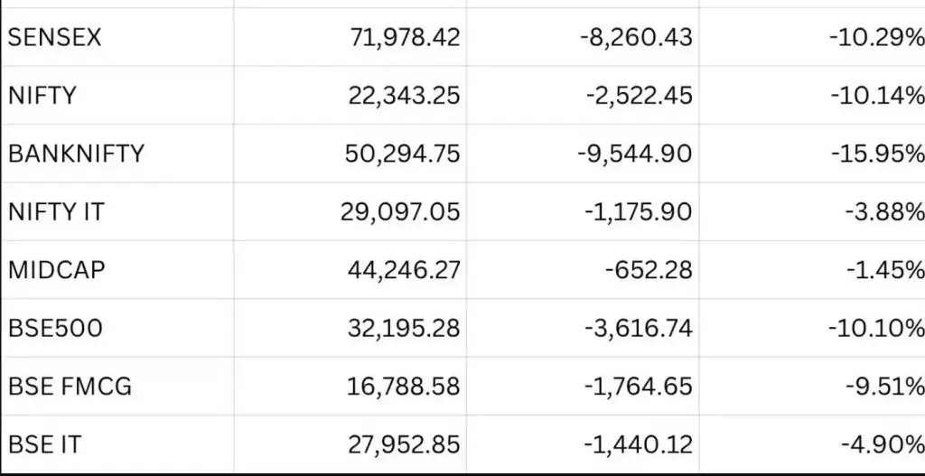 છેલ્લા બે સેશનમાં સેન્સેક્સમાં 3,326 પોઇન્ટ એટલે કે 4.42 ટકા જ્યારે નિફ્ટીમાં 975 પોઇન્ટ એટલે કે 4.18 ટકાનો ઘટાડો થયો છે. છેલ્લા બે સેશન દરમિયાન ભારતીય શેરબજારમાં લિસ્ટેડ કંપનીઓનું બજાર મૂડીકરણ એટલે કે Market Capitalisation રૂપિયા 431 લાખ કરોડથી ગગડી રૂપિયા 413 લાખ કરોડ થઈ ગયું છે. આમ આ બે સેશનમાં રોકાણકારોની સંપત્તિમાં રૂપિયા 18 લાખ કરોડનું જંગી નુકસાન થયું છે.