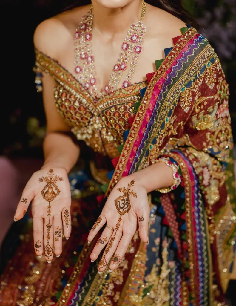 મહેંદી સેરેમનીમાં રશ્મિકાનો દેખાવ એકદમ આકર્ષક અને ક્લાસી હતો. તેણે હેવી વર્કવાળા લહેંગાની સાથે ન્યૂનતમ (Minimal) મેકઅપ રાખીને એક પર્ફેક્ટ બ્રાઇડલ લુક ક્રિએટ કર્યો હતો.