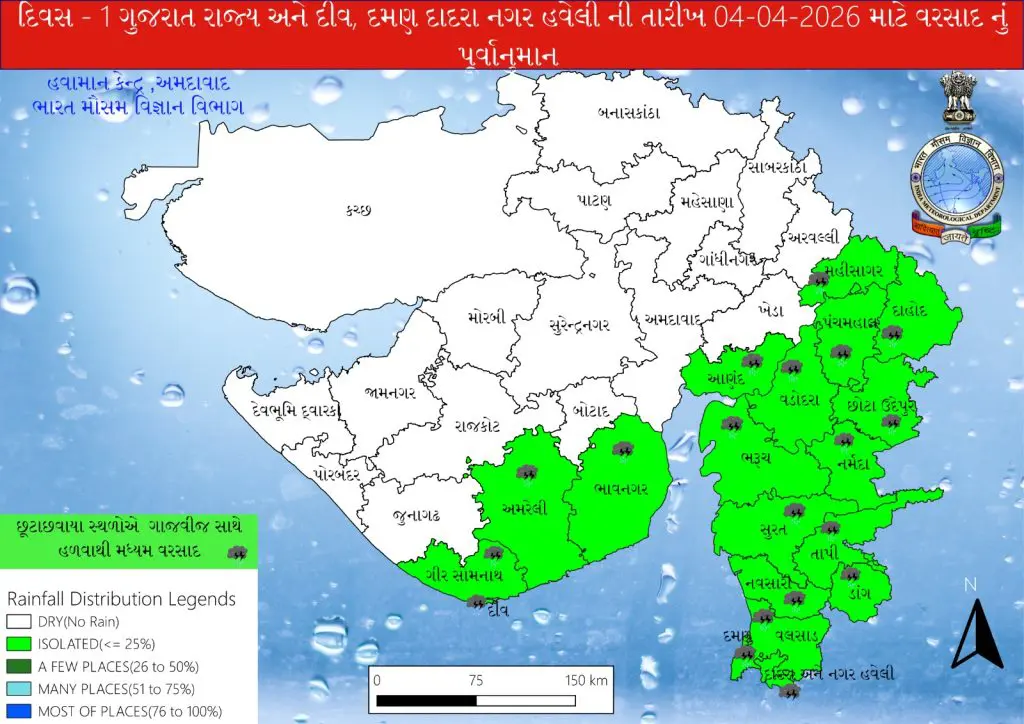 હવામાન વિભાગના જણાવ્યા અનુસાર, દેવભૂમિ દ્વારકા, પોરબંદર, જામનગર, જૂનાગઢ, રાજકોટ, અમરેલી, ગીર સોમનાથ, દીવ, ભાવનગર, ભરૂચ, નર્મદા, વડોદરા, છોટા ઉદેપુર, દાહોદ અને પંચમહાલ જિલ્લાના છૂટાછવાયા સ્થળોએ હળવો વરસાદ (5 mm/કલાકથી ઓછો) પડી શકે છે. આ દરમિયાન પવનની ગતિ 40 km પ્રતિ કલાકથી ઓછી રહેવાની ધારણા છે. વાદળછાયા વાતાવરણ વચ્ચે વીજળી પડવાની સંભાવના 30% થી પણ ઓછી વ્યક્ત કરવામાં આવી છે.