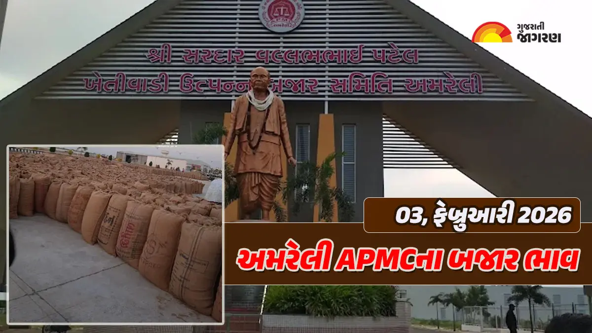 APMC Amreli Market Yard Bhav Today 03 February 2026 (અમરેલી માર્કેટ યાર્ડ ના ભાવ): અમરેલી શ્રી ખેતીવાડી ઉત્પન્ન બજાર સમિતિ ( અમરેલી APMC) દ્વારા 3 ફેબ્રુઆરી 2026ના દૈનિક બજાર ભાવ જણાવવામાં આવ્યા છે. આ ભાવ પ્રતિ 20 કિલો દીઠ છે. કપાસના ભાવ 1 હજાર રૂપિયાથી લઈને 1620 રૂપિયા સુધી રહ્યા હતા અને સરેરાશ ભાવ 1570 રૂપિયા નોંધાયો હતો.જીરુના ભાવ 2990થી 4485 રૂપિયાની સપાટીએ પહોંચ્યા હતા.