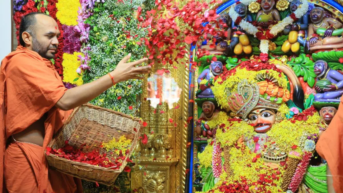 જે બાદ પ્રાન્તિક ભાષામાં લખેલા શાસ્ત્રો, પુરાણો, ઉપનિષદો અને ગાનું પણ હૃદયપૂર્વક પાઠ કરવામાં આવે છે. જેમ રાજાને સંગીત અને નૃત્ય ગમે છે, તેવી જ રીતે હનુમાનજી મહારાજની સામે શાસ્ત્રીય સંગીત સહીત વિવિધ સંગીતનાં સાધનો વડે સંગીત રજૂ કરીને હનુમાનજી મહારાજને પ્રસન્ન કરે છે. વિવિધ વસ્ત્રો, આભૂષણો, સ્વાદિષ્ટ નૈવેદ્ય અને મંગલ નિરાજન પણ હનુમાનજી મહારાજને સમર્પિત છે. 1008 કિલોથી વધુ ગુલાબની પાંખડીઓ સાથે શ્રી હનુમાનજી મહારાજના ફૂલની વર્ષા કરવામાં આવી હતી.