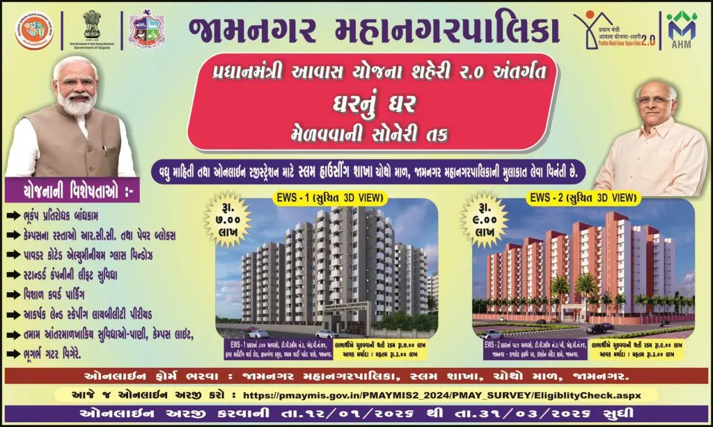 Pradhan Mantri Awas Yojana - Urban 2.0: પ્રધાનમંત્રી આવાસ યોજના - શહેરી 2.0 અંતર્ગત જામનગર શહેરમાં પણ 1300 થી વધુ આવાસ ફાળવવામાં આવ્યા છે. આ યોજનાનો લાભ મેળવવા માંગતા આર્થિક રીતે નબળા વર્ગના (EWS) ઉમેદવારો પાસે અરજીઓ મંગાવાઈ રહી છે.