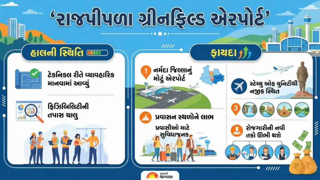 Rajpipla Greenfield Airport: ગુજરાત સરકાર દ્વારા સ્ટેચ્યુ ઓફ યુનિટી નજીક પ્રવાસનને વેગ આપવા અને પ્રાદેશિક કનેક્ટિવિટી વધારવા માટે રાજપીપળા ગ્રીનફિલ્ડ એરપોર્ટનું આયોજન કરવામાં આવ્યું છે. આ પ્રોજેક્ટ ગુજરાત સરકાર દ્વારા સૂચિત 11 નવા એરપોર્ટ પ્રોજેક્ટ્સમાંનો એક છે. જોકે, હજુ સુધી આ અંગે વધુ માહિતી જાહેર કરવામાં આવી નથી.