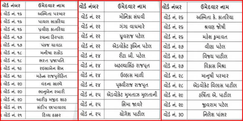 આ સાથે જ, આંતરરાષ્ટ્રીય સ્તરે આદિવાસી સમાજના યુવાઓનું પ્રતિનિધિત્વ કરતા, BSC અને B.ed. થયેલા આમ આદમી પાર્ટીના પાયાના કાર્યકર પ્રકાશ ચૌધરીને વોર્ડ નં 3 થી ટિકિટ આપવામાં આવી છે. સંઘવી પરિવારની દીકરી મોનિકા સંઘવી અને SPG સંગઠન સાથે સંકળાયેલા વીણાબેન પટેલ પણ મેદાનમાં છે.