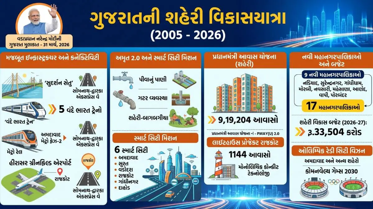 ઉલ્લેખનીય છે કે, તત્કાલીન મુખ્યમંત્રી તરીકે નરેન્દ્ર મોદીએ વર્ષ 2005ને શહેરી વર્ષ જાહેર કર્યું હતું, અને તે વર્ષ દરમિયાન શહેરી વિસ્તારોમાં માળખાગત સુવિધાઓના વિકાસ પર ધ્યાન કેન્દ્રિત કરવામાં આવ્યું હતું. ગુજરાતની આ શહેરી વિકાસયાત્રાને 2025માં 20 વર્ષ પૂર્ણ થયા અને આ 20 વર્ષો દરમિયાન ગુજરાત નોંધપાત્ર શહેરીકરણનું સાક્ષી બન્યું.