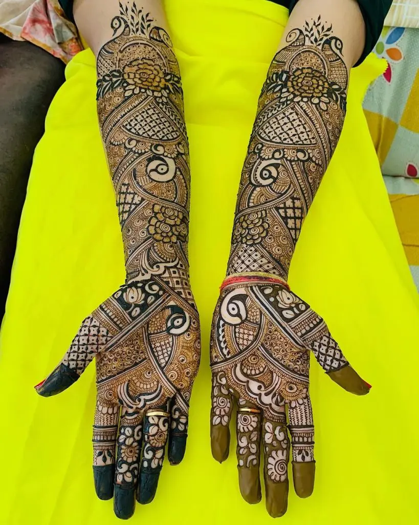 ફ્લોરલ ડિઝાઇન ક્યારેય ફેશનમાંથી બહાર જતી નથી. આ ડિઝાઇનમાં નાના-મોટા ફૂલોનો ઉપયોગ કરીને આખા હાથને કવર કરવામાં આવે છે. આ લુકને વધુ આકર્ષક બનાવવા માટે તેની સાથે 'જાલ' (મેશ) અને 'ઝુમ્મર' પેટર્ન ઉમેરી શકાય છે. પરંપરાગત અને આધુનિકતાનો આ સંગમ હથેળીથી લઈને પાછળના હાથ સુધી સુંદર દેખાય છે. જો તમે ઘાટી અને સ્પષ્ટ મહેંદી પસંદ કરતા હોવ, તો આ શ્રેષ્ઠ વિકલ્પ છે.