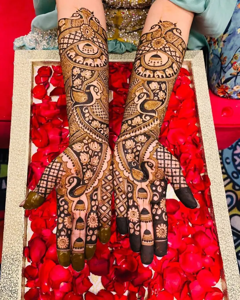 મોરની ડિઝાઇન વિના બ્રાઇડલ મહેંદી અધૂરી ગણાય. મોરના પીંછાની જટિલતા અને તેની સાથે હાથી (Elephant motifs) ઉમેરવાથી મહેંદીમાં રાજસ્થાની રાજા-મહારાજા જેવો ઠાઠ જોવા મળે છે. આ ડિઝાઇનમાં 'ક્રોસ-લેસ' વર્ક કરવાથી તે વધુ ઊપસી આવે છે અને રગ (Stain) આવ્યા પછી ખૂબ જ સુંદર લાગે છે.