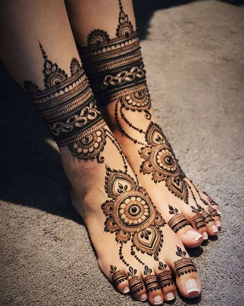 આ કટ-આઉટ મહેંદી ડિઝાઇન આજકાલ વધુને વધુ લોકપ્રિય બની રહી છે, અને તમે તમારા પગ પર બહુવિધ કટ-આઉટ પેટર્ન બનાવી શકો છો, જેમ કે ચિત્રમાં છે. આ માટે, વેલા-શૈલીની ડિઝાઇન પસંદ કરો અને મહેંદીની જટિલ પેટર્ન લગાવો.