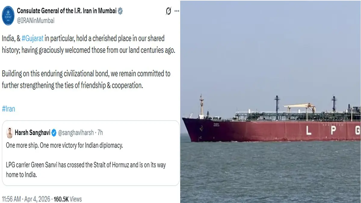 મુંબઈ સ્થિત ઈરાનના વાણિજ્ય દૂતાવાસે કહ્યું છે કે ભારત અને વિશેષ કરીને ગુજરાત સાથે અમારા ઈતિહાસમાં એક મહત્વનું સ્થાન છે. દૂતાવાસે ગુજરાતના ગૃહમંત્રી હર્ષ સંઘવીની પોસ્ટનો જવાબ આપતા આ માહિતી આપી હતી. તેમાં સંઘવીએ LPG ટેન્કર પસાર થવા તે ભારતની કૂટનીતિની જીત ગણાવી હતી.