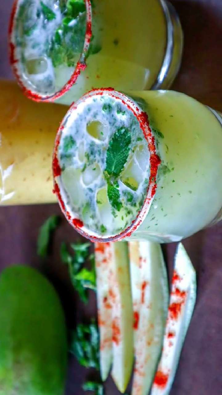 કાચી કેરી, ખાંડ અથવા ગોળ,પાણી, શેકેલું જીરું પાઉડર,સંચળ (કાળું મીઠું), મીઠું સ્વાદ મુજબ,મરી પાઉડર, તાજા ફુદીનાના પાન,ઈલાયચી પાઉડર, બરફના ટુકડા ,લીંબુની સ્લાઈસ
