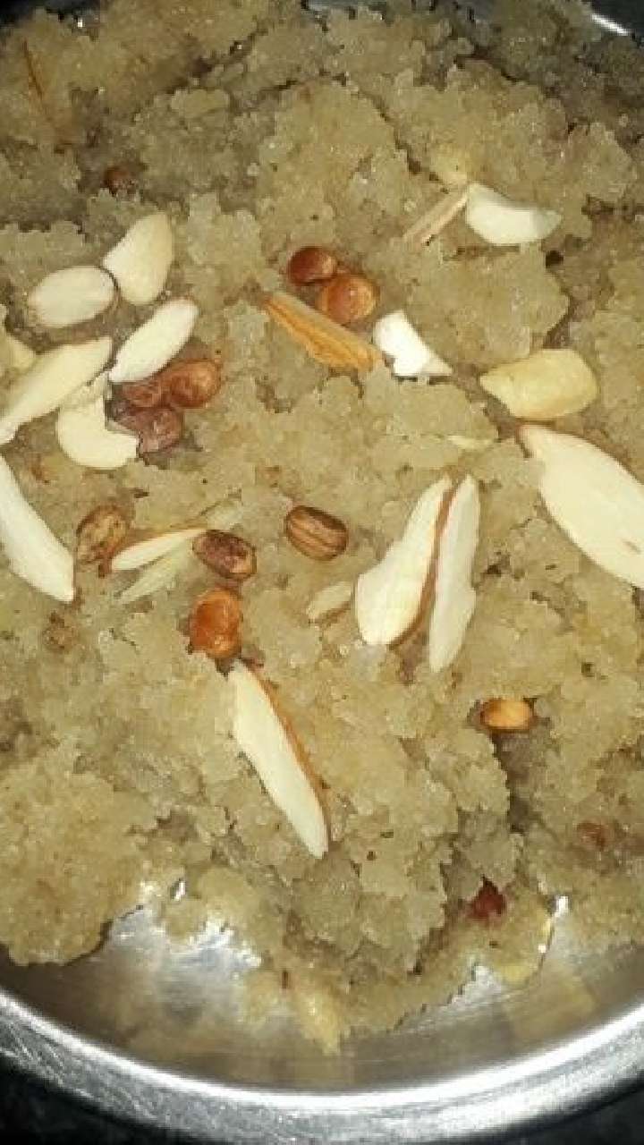 રવો,ઘી,દૂધ,સાકર,બદામ,કાજુ-કિસમિસ,એલચીનો પાવડર.