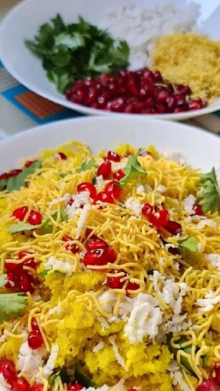 હવે એક સર્વિંગ પ્લેટમાં ખમણનો વઘારેલો ભૂકો લો અને તેની ઉપર સેવ,દાડમ,કાજુ નાખી ચટણી સાથે સર્વ કરો.